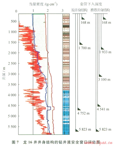 根據(jù)九龍山構(gòu)造地應(yīng)力模型和三個(gè)地層壓力剖面,對(duì)已鉆的龍16井和龍17井的井身結(jié)構(gòu)和鉆井液密度安全窗口進(jìn)行了風(fēng)險(xiǎn)評(píng)估(圖7)。從維持井壁穩(wěn)定性角度考慮,分析其井身結(jié)構(gòu)和鉆井液密度安全窗口存在較大的缺陷,致使中間技術(shù)套管段無可操作的鉆井液密度安全窗口,井壁穩(wěn)定性變差,這可能是兩井在該段頻繁出現(xiàn)遇阻、卡鉆甚至鉆井事故的力學(xué)根源;同時(shí)海相地層的鉆井液密度安全窗口也非常窄,極易誘發(fā)井漏、井涌溢流復(fù)雜。