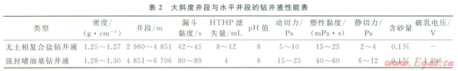 該井Æ215.9mm井段采用無土相復合鹽鉆井液體系,通過加入無機鹽和有機鹽提高體系抑制性[9]。在井斜角30°、45°、60°時需調(diào)整控制鉆井液的密度;通過增加陽離子乳化瀝青粉和細目碳酸鈣的含量,提高封堵性來降低地層的坍塌壓力;嚴格控制鉆井液的濾失量,要求APl濾失量控制在2mL以內(nèi),該體系抑制性強、固相含量比較低(表2),性能穩(wěn)定,有效提高機械鉆速[10]。