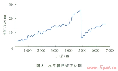 在長水平段水平井鉆井過程中,由于鉆具與井壁底部形成的巖屑床相互作用,鉆井液固相含量高導致潤滑效果下降等[4]原因,鉆具與井壁之間的摩擦阻力隨著水平段長度的增加而不斷增大,影響水平段鉆進長度。根據(jù)常規(guī)水平井實鉆分析,裸眼內(nèi)摩擦系數(shù)比套管內(nèi)摩擦系數(shù)大。Æ215.9mm井眼的水平段鉆至4851m,鉆水平段長度1200m,下Æ177.8mm套管固井。根據(jù)現(xiàn)場施工獲得的扭矩、摩阻數(shù)據(jù)分析(圖2、3),通過優(yōu)化井身結(jié)構(gòu),有效降低了長水平段施工過程中的摩阻系數(shù),提高了施工效率。