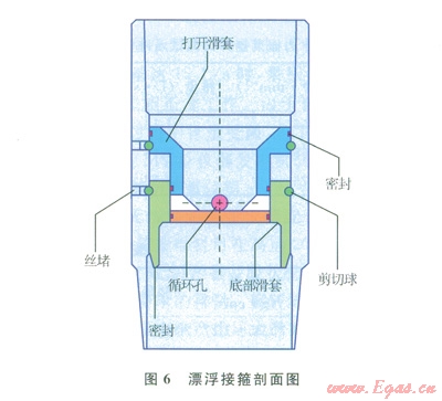 為了順利將Æl77.8mm套管下入長1200m的Æ215.9mm井眼內(nèi),在套管串中應用了漂浮接箍(圖6)。漂浮接箍上部的套管柱灌入鉆井液,下部的套管內(nèi)部充滿空氣(沒有鉆井液),漂浮接箍下部套管入井后受到鉆井液的浮力作用降低了井壁對套管柱的摩擦阻力;而漂浮接箍上部的套管內(nèi)灌有鉆井液會增加套管柱的重量,確保套管順利入井。下到預定深度后向套管內(nèi)加壓,直到扣‘開滑套向下移動讓鉆井液與空氣進行交換。當流動穩(wěn)定后,整個套管柱內(nèi)都充滿了鉆井液投入下膠塞,注入水泥漿,浮鞋盲板打開。當下膠塞坐定在滑套上后,剪斷銷釘,水泥漿就把下膠塞和漂浮接箍的兩個滑套一起下推向下部的浮箍下膠塞和兩個滑套坐定在浮箍上,并與浮箍密封。下膠塞破裂,水泥漿通過浮鞋泵出,頂替上膠塞,并與浮箍處的下膠塞和漂浮接箍組件形成密封,確保固井質(zhì)量。