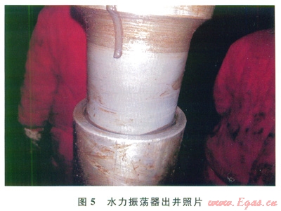 該井鉆至6069m,為了提高滑動施工效率,水平段鉆具組合中應用了水力振蕩器。根據(jù)水力振蕩器安裝原則,在鉆具組合中距離鉆頭位置的已鉆水平段長度的l/3處安裝,即該趟鉆中水力振蕩器距離鉆頭位置720m。在不同排量的情況下,在井口對水力振蕩器進行壓力測試(表1)。下鉆到底后,泵沖65沖/min,泵壓23.0MPa,加壓至40~60kN,泵壓24.5~25.2MPa(未使用水力振蕩器時,泵沖65沖/min,泵壓是23~25MPa)。復合鉆進至井深6105m,進尺36m后需要調(diào)整軌跡進行滑動鉆進,但活動鉆具上提摩擦阻力18t,下放28~40t,經(jīng)過多次劃眼后,下放摩擦阻力依然較高,在20~30t(圖2),調(diào)整工具面依然困難,滑動鉆進效果差。進行多次嘗試后,工具面依然調(diào)整困難。通過調(diào)整泵沖,改變排量,鉆進至6415m,鵝頸管刺漏起鉆。起出水力振蕩器后井口測試,工具不工作,振動短節(jié)不振動,而且振動短節(jié)振動處有膠皮露出,這可能導致其在使用進尺36m后,不能起到傳遞鉆壓和振動效果的原因(圖5)。