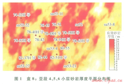 在有效厚度三維模型的基礎上,提取了各小層有效厚度的疊合圖,形成盒8下亞段4、5、6小層的有效厚度疊合圖(圖6),從平面上反映r有效儲層的分布范圍和趨勢。通過地質建模預測盒8下亞段4、5、6小層累計有效砂巖厚度為0~22m,基本呈連片分布,與沉積特征相一致,該區(qū)中部、南部及西部的78-33H導井區(qū)有效厚度最大,達到20m左右;低值區(qū)主要分布在蘇53-7井東部、82-37H導井區(qū)、蘇53-8井區(qū)附近等,有效厚度小于3m,反映了區(qū)內氣藏的分布規(guī)律。