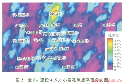 從平面上看,相對高孔儲層在側向上和縱向均被相對低孔儲層所分隔,大致成北北東—南南西條帶狀分布(圖2),孔隙度井間差異較大。