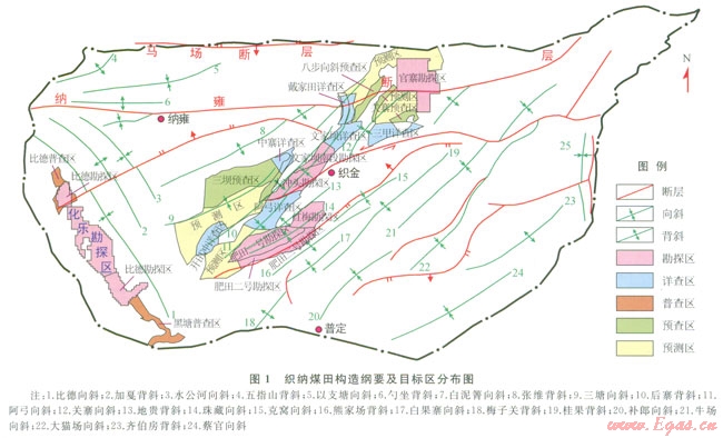 織納煤田位于貴州省中西部,主要包括比德向斜、三塘向斜、阿弓向斜、珠藏向斜、關(guān)寨向斜5個(gè)向斜單元,含煤面積約為l016.3km2,區(qū)內(nèi)煤田地質(zhì)工作程度高,除煤炭預(yù)測及預(yù)查區(qū)外,煤炭勘查面積達(dá)695.64km2,煤炭總資源量為90.33×108t;據(jù)貴州省煤田地質(zhì)局l996年提交的“貴州省煤層氣資源評價(jià)報(bào)告”[1],織納煤田煤層氣資源量為7611×108m3,但該區(qū)煤層氣的系統(tǒng)評價(jià)還很薄弱。因此,對煤出煤層氣資源狀況、賦存條件進(jìn)行全面分析和評價(jià),優(yōu)選煤層氣重點(diǎn)勘查和開發(fā)區(qū)塊很有必要[2-4]。