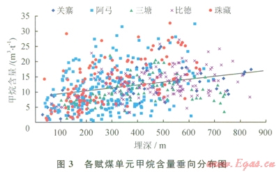 全區(qū)含氣量為0.48~32.69m3/t,平均為ll.90m3/t,各向斜以東部的關(guān)寨向斜最高,平均含量為15.47m3/t,比德向斜和珠藏向斜次之,平均含量分別為12.94、12.54m3/t,阿弓向斜最低,平均含量為10.15m3/t;氮?dú)夂坎桓?,一般小?span lang="EN-US">2m3/t;蕈烴平均含量0.75m3/t;全區(qū)甲烷含量以肥田二號最高,平均為l6.90m3/t。評價(jià)區(qū)總體顯示甲烷含量隨埋深的增加而增加,趨勢較為明顯,表明埋深對煤層氣含氣性具有重要的控制作用(圖3)。