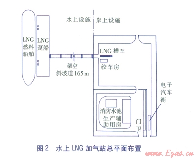 該方案是將LNG的裝卸、儲存及配套的供電、消防、控制設施設在岸上的LNG站區(qū)內(nèi),水上的躉船上不設LNG儲罐,只設LNG加氣機、加氣臂等加氣設施,進行岸上儲存、船上加氣作業(yè)。