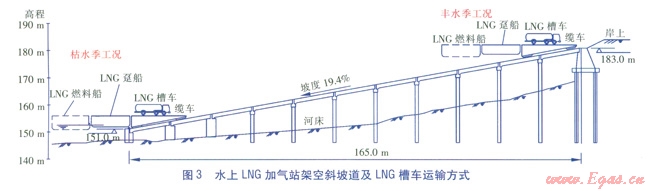 水上LNG加氣站架空斜坡道及LNG槽車運輸方式見圖3。