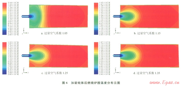 1)過(guò)量空氣系數(shù)為1.05、1.15、1.25、1.35這4種工況下,燃燒器的燃燒效率均可超過(guò)99.8%;隨著過(guò)量空氣系數(shù)增大,爐膛的峰值溫度降低;過(guò)量空氣系數(shù)較大時(shí),容易在燃燒器根部形成高溫區(qū)域;未加裝鈍體時(shí),NO的生成量較大,NO的生成量隨過(guò)量空氣系數(shù)的增加而減小。