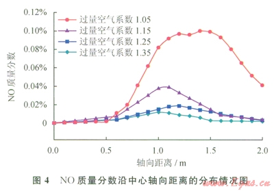 從圖2可以得出,a為1.05時(shí)的溫度峰值最大,達(dá)到2465K;其次是a為1.25時(shí),溫度峰值為2313K;再次是a為1.15時(shí),溫度峰值為2240K;a為1.35時(shí),溫度峰值最小,為2174K。a為1.35時(shí)的溫度峰值離燃燒器出口最近,且溫度上升很快,在X為0.60m處,溫度就達(dá)到了最大值,而a為1.05時(shí)的溫度峰值離燃燒器出口最遠(yuǎn),在X為1.08m時(shí)溫度才達(dá)到最大值。這主要是由于,a為1.35為所有模擬工況中的最大過(guò)量空氣系數(shù),在空氣與燃?xì)饣旌先紵龝r(shí),氧氣含量充足,著火最快,溫度很快就達(dá)到最大值,而a為1.05時(shí)燃?xì)馀c氧氣混合相對(duì)不夠均勻,達(dá)到最高溫度的區(qū)域向后推遲。
