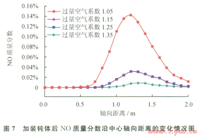 數(shù)值研究結(jié)果表明,加裝鈍體后甲烷的質(zhì)量分?jǐn)?shù)在出口處為0,加裝鈍體能夠?qū)崿F(xiàn)頁(yè)巖氣的完全燃燒。加裝鈍體優(yōu)化后,燃?xì)鈬姵龊笥龅解g體擾流,產(chǎn)生一定的回流區(qū)域,使高溫炯?xì)饣亓?,并加熱剛噴出的燃?xì)?,使其迅速燃燒,減少了著火時(shí)間。圖7為加裝鈍體后NO質(zhì)量分?jǐn)?shù)沿中心軸向距離的變化情況,與圖4中未加裝鈍體優(yōu)化前進(jìn)行對(duì)比,加裝鈍體優(yōu)化后,在相同位置處NO的質(zhì)量分?jǐn)?shù)明顯降低,主要是由于加裝鈍體后,爐膛溫度有所降低,同時(shí)爐膛溫度較均勻。因此NO的生成量較少。