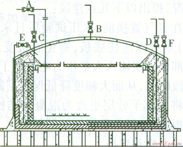 氮?dú)庵脫Q需先置換內(nèi)罐后置換環(huán)形空間,以避免置換過程中對(duì)內(nèi)罐壁板產(chǎn)生額外的壓力。置換管路見圖2。置換方法為:首先打開A閥和8閥,氮?dú)鈴腁閥進(jìn)入,進(jìn)行內(nèi)罐和拱頂?shù)闹脫Q;然后關(guān)閉B閥,打開c閥進(jìn)行環(huán)形空間的置換;接著關(guān)閉c閥,打開D閥進(jìn)行內(nèi)罐罐底干砂層的置換;最后關(guān)閉D閥,打開E閥和F閥進(jìn)行底部保冷空間的置換[8]。