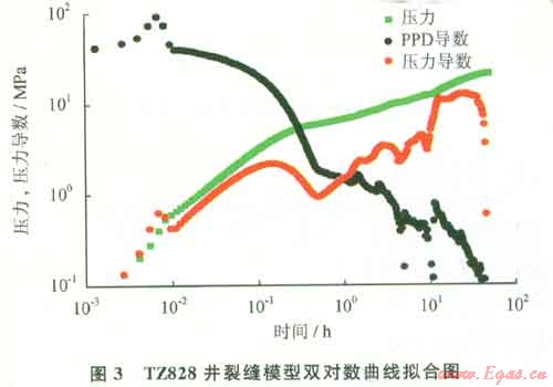 裂縫井模型也是塔中碳酸鹽巖儲(chǔ)層的主要類型之一,此類井由于基質(zhì)孔滲條件差,能量補(bǔ)給不足,相應(yīng)的產(chǎn)能低、遞減快。如TZ828井,5595~5603m儲(chǔ)層的沉積環(huán)境主要為粒屑灘、礁丘亞相,礁翼、中高能砂屑灘微相。巖性生屑砂屑灰?guī)r、層孔蟲骨架巖,含大量棘屑、發(fā)育溶洞、灰色生物礁灰?guī)r、見高角度構(gòu)造縫和蜂窩狀溶蝕孔洞。孔隙度平均值為1.8%,儲(chǔ)層類型以Ⅰ、Ⅱ類為主。試油期間開井流動(dòng)曲線近似一條直線,開井期間地面無產(chǎn)出,表明地層無自噴能力;關(guān)井壓力曲線恢復(fù)緩慢,反映儲(chǔ)層為低滲透儲(chǔ)層。二次關(guān)井導(dǎo)數(shù)曲線后期出現(xiàn)不規(guī)則,是由于井筒相變的影響造成的,如圖3所示,試井解釋只能用10h以內(nèi)的數(shù)據(jù)。