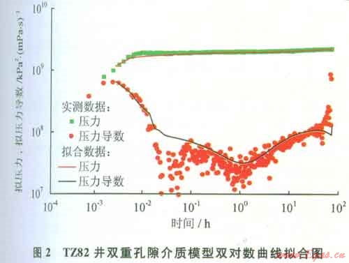 如TZ82井,5430~5487m井段測(cè)井解釋孔隙度為1.35%。沉積亞相為灰泥丘,微相為丘核與丘坪。在5430~5450m井段微相為丘坪,巖性為灰白色含砂屑泥晶灰?guī)r,大量晶洞全充填,少量半充填;5450~5490m井段微相為丘核,巖性為深灰白隱藻泥晶灰?guī)r,下部見大量晶洞被白色方解石充填。主要發(fā)育Ⅳ類儲(chǔ)層。試井解釋模型采用雙孔模型(圖2)。