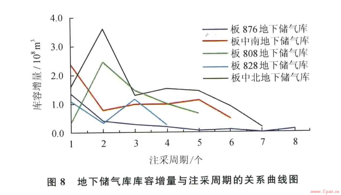 2)地下儲(chǔ)氣庫(kù)投產(chǎn)初期庫(kù)容增速快,后期增速變緩。從地下儲(chǔ)氣庫(kù)庫(kù)容增量與注采周期關(guān)系曲線看(圖8),盡管地下儲(chǔ)氣庫(kù)不同、注采周期不同,但基本遵循了早期擴(kuò)容多、后期擴(kuò)容少、庫(kù)容逐漸增加的規(guī)律。水淹衰竭型氣藏改建地下儲(chǔ)氣庫(kù)后,第1注采周期由于地層壓力低,地下儲(chǔ)氣庫(kù)虧空大,注入氣以彌補(bǔ)空余的孑L隙空間為主,庫(kù)容增加快。一旦第1注采周期補(bǔ)虧庫(kù)容之后,隨著地下墊氣量增多和地層壓力水平的提高,第2注采周期達(dá)容主要體現(xiàn)在以氣驅(qū)水置換水體孔隙空間為主,驅(qū)水?dāng)U容成為主要增容方式,增容難度增大,增容幅度變小。同時(shí)此階段也真實(shí)反映了地下儲(chǔ)氣庫(kù)地層水體對(duì)庫(kù)容的影響效果。