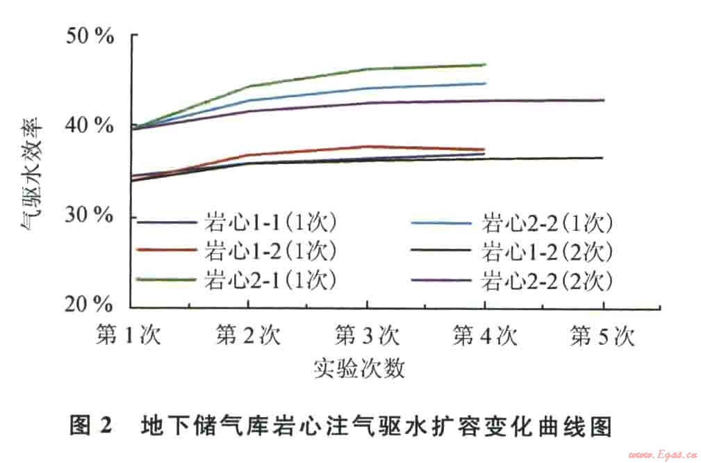 實(shí)驗(yàn)結(jié)果揭示:地下儲(chǔ)氣庫(kù)內(nèi)的含水區(qū)可以實(shí)現(xiàn)較高的氣體驅(qū)替,4塊巖心的氣驅(qū)試驗(yàn)壓力降落區(qū)間為地下儲(chǔ)氣庫(kù)原始?jí)毫Φ?00%~29%時(shí),第l次氣體驅(qū)替效率可達(dá)到34%~40%,第2、3次累加氣驅(qū)效率可達(dá)36%~46%;地下儲(chǔ)氣庫(kù)實(shí)際注采生產(chǎn)過(guò)程中隨多周期的注采驅(qū)替,氣驅(qū)水達(dá)容效率是逐步增加的過(guò)程,或者說(shuō)若要實(shí)現(xiàn)地下儲(chǔ)氣庫(kù)較高的氣體驅(qū)替效率,則需要多年的注采周期。