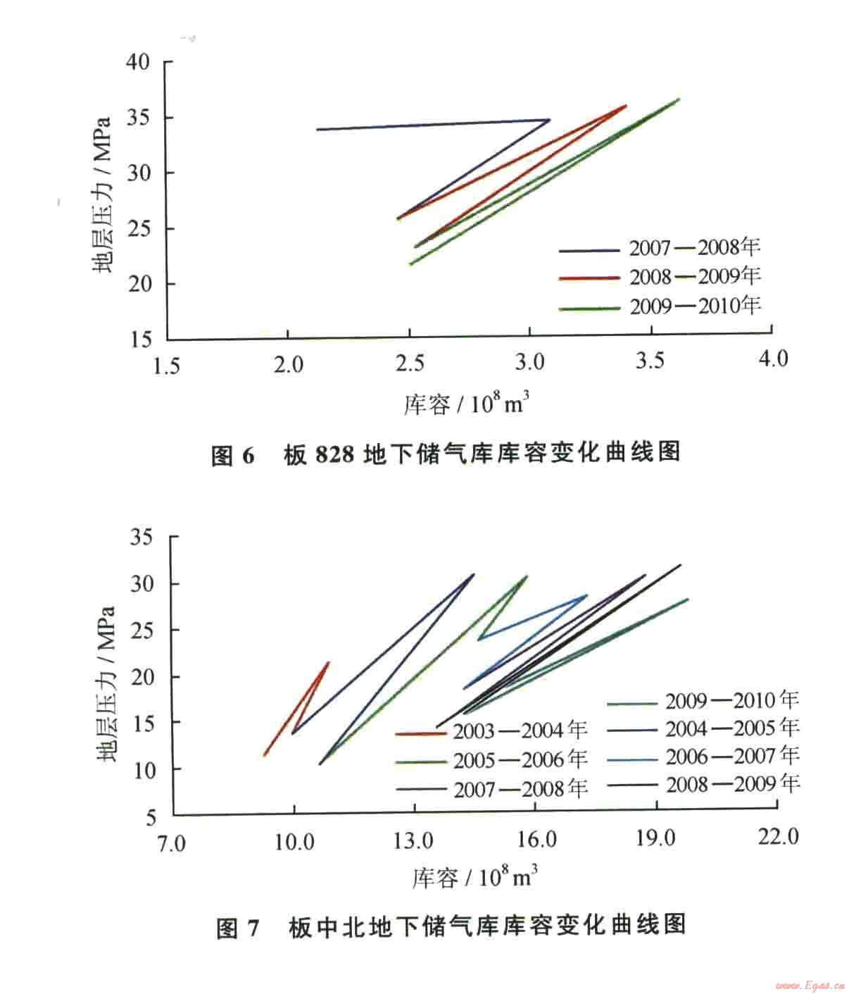 1)地下儲(chǔ)氣庫(kù)庫(kù)容量呈現(xiàn)逐漸增加的趨勢(shì),并最終趨于最大庫(kù)容量。以注氣期結(jié)束時(shí)的庫(kù)容量為地下儲(chǔ)氣庫(kù)的當(dāng)期庫(kù)容量,采氣期結(jié)束時(shí)的庫(kù)容量為地下儲(chǔ)氣庫(kù)的當(dāng)期墊氣量,庫(kù)容量與墊氣量之差即為當(dāng)期工作氣量(采氣量)。從地下儲(chǔ)氣庫(kù)的實(shí)際庫(kù)容量變化曲線看(圖3~7),隨著地下儲(chǔ)氣庫(kù)注采周期的增加,庫(kù)容曲線普遍右移,地下儲(chǔ)氣庫(kù)庫(kù)容明顯增大,而且注采周期越多,庫(kù)容增加愈多。板876地下儲(chǔ)氣庫(kù)運(yùn)行5~8個(gè)注采周期時(shí),庫(kù)容變化曲線基本重疊,表明地下儲(chǔ)氣庫(kù)已達(dá)到最大庫(kù)容量。由此也說(shuō)明地下儲(chǔ)氣庫(kù)達(dá)容是一個(gè)長(zhǎng)期的過(guò)程。從已建地下儲(chǔ)氣庫(kù)的達(dá)容特征看,水淹型地下儲(chǔ)氣庫(kù)的達(dá)容周期超過(guò)5年。