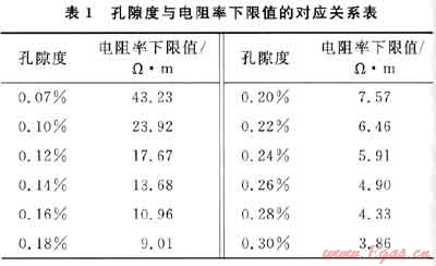 根據(jù)工區(qū)地層水電阻率、含氣飽和度、膠結(jié)指數(shù)、飽和度指數(shù)等參數(shù),建立孔隙度與氣層電阻率下限值關(guān)系,并計(jì)算氣層電阻率下限值關(guān)系曲線[4~5],比較該曲線與深側(cè)向電阻率值大小來判別儲(chǔ)層。即:電阻率值大于氣層下限值,為氣層;否則為氣水同產(chǎn)或產(chǎn)水。表1為某區(qū)塊孔隙度與電阻率下限值,由此獲得了氣層下限電阻率計(jì)算公式為: