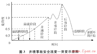 從以上分析可以得出:潛伏階段、溢流階段、井涌階段是井噴的安全流變階段,直到發(fā)生突變,才進(jìn)入井噴的極不安全狀態(tài)。在此過(guò)程中,井內(nèi)壓力不斷減小、地層流體(石油、天然氣、水等)壓力不斷增大、鉆井液密度不斷降低致使鉆井液液柱壓力小于地層壓力,最終導(dǎo)致地層流體不斷流入井內(nèi),從而進(jìn)一步向著井噴方向發(fā)展。如果該階段沒(méi)有采取有效的措施進(jìn)行控制,便會(huì)向著井噴的方向發(fā)展,整個(gè)系統(tǒng)便由安全流變狀態(tài)向安全突變的方向轉(zhuǎn)變。當(dāng)油氣井處于安全流變階段時(shí),整個(gè)系統(tǒng)還處于相對(duì)安全的狀態(tài);但一旦轉(zhuǎn)入突變,系統(tǒng)就會(huì)由安全狀態(tài)轉(zhuǎn)變?yōu)槲kU(xiǎn)狀態(tài)。因此,要控制井噴事故,關(guān)鍵就是要將其控制在流變階段,進(jìn)而消除危險(xiǎn)源,防止其向突變的方向轉(zhuǎn)化。但如果突變之前沒(méi)有采取有效的抑制措施,最終導(dǎo)致了井噴事故的發(fā)生,也就是系統(tǒng)進(jìn)入了安全突變階段,此階段最重要的就是要在保證人員和設(shè)備安全的情況下盡可能控制井噴范圍的擴(kuò)大,最大限度地降低井噴所造成的損傷。