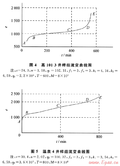 圖4中的AB段是油氣井在外界作用下的減速損傷階段,與承載的時(shí)間關(guān)系不大,為瞬間損傷。在第一保護(hù)區(qū)的作用下,損傷速度由大變小,損傷加速度小于0。BC段是油氣井等速損傷階段,此階段流變曲線形似一條直線,損傷速度接近常數(shù),損傷加速度為0。CD段是油氣井加速損傷階段,此階段損傷速度不斷增大,加速度也大于0。AD段是安全流變階段,其中D點(diǎn)是突變警戒點(diǎn),從此點(diǎn)開(kāi)始油氣井的運(yùn)動(dòng)開(kāi)始發(fā)生了質(zhì)變,進(jìn)入了危險(xiǎn)狀態(tài)。DE屬于安全突變階段。