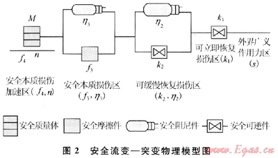 安全流變 突變的物理模型由4組元件組成(如圖2)。整個(gè)系統(tǒng)框架模型分為5個(gè)層次:外界廣義作用力區(qū)、可立即恢復(fù)損傷區(qū)、可緩慢恢復(fù)損傷區(qū)、安全本質(zhì)損傷區(qū)、安全本質(zhì)損傷加速區(qū),每個(gè)層次的反應(yīng)機(jī)理和作用各不相同。事物就是在這種模型下對(duì)外界廣義作用力作出相應(yīng)的反應(yīng),最終決定事物是處于安全狀態(tài)還是危險(xiǎn)狀態(tài)的。