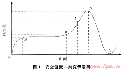 假設(shè)將事物的危險(xiǎn)狀態(tài)用損傷程度來(lái)表示,那么事物的“安全流變-突變”的全過(guò)程可以表述為(如圖1):當(dāng)某一事物誕生后的初期(OA階段),其損傷量在外界力的作用下呈減速遞增,新的狀態(tài)在此期間逐漸形成和完善。當(dāng)新的狀態(tài)發(fā)展到成熟階段時(shí)(AB階段),完善的新?tīng)顟B(tài)使損傷量勻速緩慢增加。當(dāng)經(jīng)過(guò)一段穩(wěn)定增加后,原狀態(tài)將再次向無(wú)序方向發(fā)展,進(jìn)而使損傷量值開(kāi)始加速增大(BC段)。任何事物都有其固有的損傷量承受能力或臨界點(diǎn)(D點(diǎn)),超出此臨界點(diǎn)(D點(diǎn))后,事物將發(fā)生安全突變。當(dāng)事物的原狀態(tài)遭到破壞后,事物又重新回到一個(gè)新的安全狀態(tài),原事物的狀態(tài)消失,從而又形成了另一個(gè)同類新事物誕生的新起點(diǎn)(E點(diǎn))。物質(zhì)世界就是在這種安全與危險(xiǎn)的無(wú)限循環(huán)中得以存在和發(fā)展的[4]。
