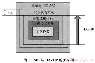 本文參考文獻[6-9]就SIL在不同SIS中的應用情況,分析了SIL技術的評估方法、過程和應用環(huán)境,不過都把SIL作為一種獨立的分析方法應用在評估對象上。本文參考文獻[10]給出了SIL與HAZOP的關系圖,如圖1所示。圖1中SIL評估與HAZOP分析以明確的界限分隔開來,這種劃分是建立在保護層分析(LOPA)基礎上的。實際上,SIL評估的主要對象是安全儀表系統(tǒng),但是在驗證SIL等級時,是需要分析基本控制單元、系統(tǒng)報警和人工操作情況的,而HAZOP分析控制系統(tǒng)的防護措施時也會涉及安全儀表系統(tǒng),二者之間是存在交叉區(qū)域的。