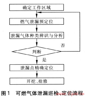日常的巡檢可采用車載或便攜檢測(cè)設(shè)備確定工作區(qū)域,如發(fā)現(xiàn)泄漏還需對(duì)泄漏氣體進(jìn)行種類辨識(shí),排除其他氣體(如沼氣)的干擾。對(duì)已經(jīng)確定泄漏的管段可先實(shí)施對(duì)泄漏點(diǎn)的預(yù)定位,由在線檢測(cè)或日常巡檢確定泄漏的大致區(qū)域,再進(jìn)行精確定位,如遇硬質(zhì)路面或在大片區(qū)域內(nèi)均檢測(cè)到高濃度可燃?xì)怏w,需結(jié)合路面鉆孔機(jī)和吸真空系統(tǒng)打孔定位??扇?xì)怏w泄漏巡檢、定位流程見(jiàn)圖1。