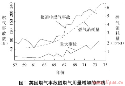 隨著我國(guó)城鎮(zhèn)燃?xì)馐褂玫钠占?,室?nèi)燃?xì)馐鹿室矊映霾桓F,如何減少室內(nèi)燃?xì)馐鹿蕩?lái)的生命傷害和財(cái)產(chǎn)損失是人們持續(xù)關(guān)注的焦點(diǎn)。統(tǒng)計(jì)表明,燃?xì)獗ǖ氖鹿蕯?shù)與燃?xì)庥脩艉腿細(xì)庀膸缀醭烧?,如圖1所示為英國(guó)燃?xì)馐鹿实慕y(tǒng)計(jì)。為了維護(hù)燃?xì)饪蛻舻纳?cái)產(chǎn)安全,有必要對(duì)事故的成因、規(guī)律及危害進(jìn)行分析以找出相應(yīng)的防范措施。本文就是探索這類事故產(chǎn)生和發(fā)展的規(guī)律,提出有效的預(yù)防和控制措施,解決目前燃?xì)庑袠I(yè)亟待解決的居民用戶安全問(wèn)題,因此具有重大的社會(huì)經(jīng)濟(jì)效益。