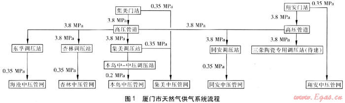 廈門市液化天然氣利用工程于2008年1月全面開工建設(shè),是福建省LNG工程總體項(xiàng)目的9個子項(xiàng)目之一。2010年建設(shè)規(guī)模為年供氣1.5568×108m3/a,最大供氣量為53.4×104m3/d,供應(yīng)居民用戶約30.9×104戶。該工程主要分為兩部分:a.天然氣高中壓輸配系統(tǒng)。建設(shè)門站2座(集美門站、翔安門站)、高-中壓調(diào)壓站4座(東孚調(diào)壓站、杏林調(diào)壓站、集美調(diào)壓站、同安調(diào)壓站)和中-中壓調(diào)壓站1座(本島調(diào)壓站);敷設(shè)高壓輸氣管道27.78km,中壓輸氣管道12.22km,中壓輸配管道488.45km。工程總造價達(dá)6.28×108元。b.置換和發(fā)展天然氣用戶62×104戶。廈門市天然氣供氣系統(tǒng)流程見圖1。