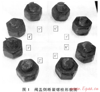 閥蓋上的8個螺栓光孔均發(fā)生了月牙形磨損或擠壓變形成為橢圓形,其中橢圓長軸沿徑中心。對光孔長軸和短軸進行測量并計算橢圓度,發(fā)現(xiàn)1#、2#、3#、8#光孔比4#、5#、6#、7#光孔橢圓度大(光孔編號與螺栓編號一一對應)。