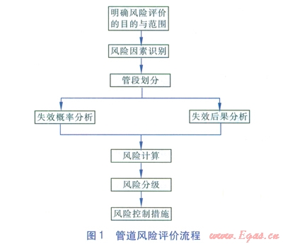 風(fēng)險(xiǎn)評(píng)價(jià)是指識(shí)別出對(duì)管道安全運(yùn)行產(chǎn)生不利影響的風(fēng)險(xiǎn)因素,評(píng)價(jià)事故發(fā)生的可能性和后果,綜合得到管道風(fēng)險(xiǎn)大小,并提出相應(yīng)風(fēng)險(xiǎn)控制措施的分析過(guò)程[6]。風(fēng)險(xiǎn)評(píng)價(jià)是完整性管理的關(guān)鍵環(huán)節(jié),應(yīng)根據(jù)評(píng)價(jià)范圍、復(fù)雜程度采用不同的方法和技術(shù)。管道風(fēng)險(xiǎn)評(píng)價(jià)流程見(jiàn)圖l,其中的幾個(gè)主要環(huán)節(jié)一般為風(fēng)險(xiǎn)因素識(shí)別、失效概率分析、失效后果分析和風(fēng)險(xiǎn)分級(jí)。