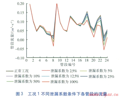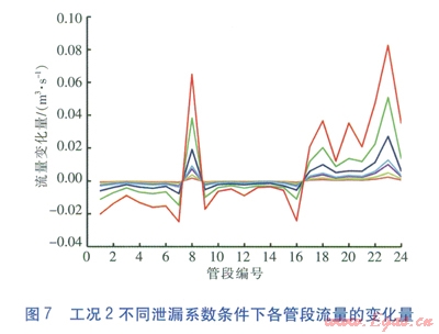對上述數(shù)據(jù)進行處理,求得工況l不同泄漏系數(shù)條件下各管段流量相對于正常工況流量的變化量,即正常工況時管段的流量減去泄漏工況時管段的流量,見圖5。