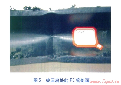 2011年1月,在對(duì)de63mm規(guī)格PE管進(jìn)行壓扁阻斷作業(yè)過(guò)程中發(fā)現(xiàn),PE管的復(fù)原情況不理想。隨即,我們對(duì)壓扁處PE管進(jìn)行切割,發(fā)現(xiàn)PE管內(nèi)壁損傷嚴(yán)重,壓扁處出現(xiàn)明顯減薄并出現(xiàn)裂紋,被壓扁處的PE管剖面見圖5。