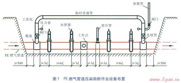 壓扁阻斷作業(yè)涉及的設(shè)備較多,加之夾扁影響區(qū)有一定長(zhǎng)度,因此對(duì)各種設(shè)備的間距有一定要求(見圖l),而且工作坑長(zhǎng)度須滿足各種設(shè)備的間距要求。