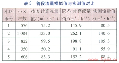 為了驗(yàn)證計算得到的同時工作系數(shù)的準(zhǔn)確性,下面分別利用同時工作系數(shù)K與K計算該地區(qū)5個小區(qū)的管段流量,并將結(jié)果與實(shí)測流量值進(jìn)行對比,見表3。