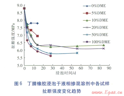 ②DME與LPG的液相對丁腈橡膠不同性能的影響不同。其中摻混液對丁腈橡膠的體積變化率影響最大,質(zhì)量變化率影響次之。對丁腈橡膠的壓縮永久變形量有一定影響,對扯斷伸長率及硬度等力學(xué)性能的影響較小。
