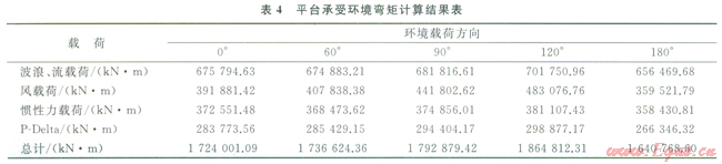 表3、4分別為平臺(tái)在該海域所受到各方向環(huán)境載荷、彎矩計(jì)算結(jié)果。