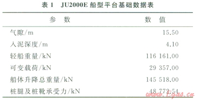 以現(xiàn)今主流的400Ft自升式JU2000E船型為基礎(chǔ)建立等效有限元模型,選取我國東海黃巖海域?yàn)槟M環(huán)境海區(qū),平臺(tái)自身性能參數(shù)如表l所示,海區(qū)環(huán)境參數(shù)基本數(shù)據(jù)如表2所示。
