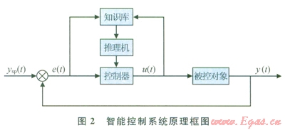 智能控制系統(tǒng)由知識(shí)庫(kù)、推理機(jī)及控制器組成,基本模型見(jiàn)圖2。圖2中u(t)為控制量,e(t)為偏差,ysp(t)為設(shè)定值,y(t)被控參數(shù)如流量、壓力、溫度等。控制量u(t)與多種變量或事實(shí)相關(guān),構(gòu)成復(fù)雜的函數(shù)關(guān)系或變化規(guī)則。