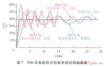 引用智能積分控制系數(shù),隨機(jī)改變積分強(qiáng)度,偏差越大、積分作用越強(qiáng),偏差越小、積分作用越弱。效果見(jiàn)圖6、7,圖中縱坐標(biāo)y(t)/Y表示被控參數(shù)與量程的百分比。