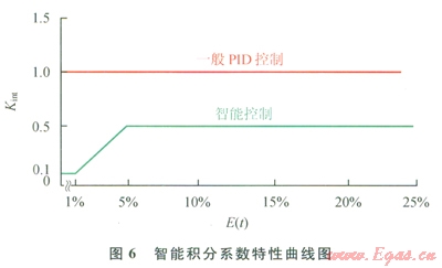 可見(jiàn),采用智能控制,可使偏差快速穩(wěn)定收斂,當(dāng)[å|e(t)|/n]/Yset≥5%時(shí),采用固定比例控制,當(dāng)[å|e(t)|/n]/Yset≤5%時(shí),采用一定時(shí)間(大約0.5個(gè)波動(dòng)周期)相對(duì)偏差絕對(duì)值的均值(10/Yset)[ å|e(t)|/n]作為改變控制量的隨機(jī)變動(dòng)系數(shù),智能系數(shù)Kint,與E(t)在5%以下時(shí)呈線性遞增關(guān)系,控制量u(t)與E(t)呈非線性遞增關(guān)系。