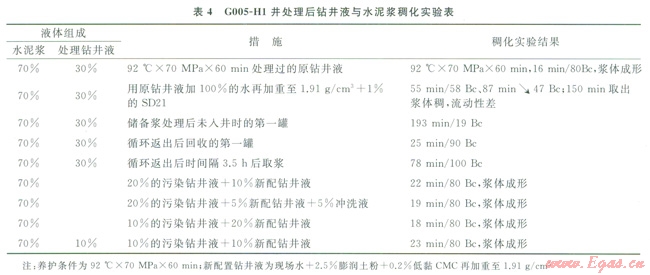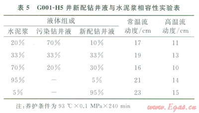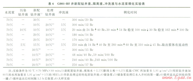在CO2對鉆井液污染嚴重的情況下,為保證固井施工安全,有條件的情況下可以對鉆井液進行全井或部分置換,防止鉆井液與水泥漿間接觸而提前稠化,影響固井施工安全。G00l-H5井固井前,井漿黏度和切力較高、循環(huán)壓耗大,在多次處理鉆井液不能滿足固井施工要求情況下,利用儲備鉆井液處理后對原井漿進行全井替換,并配置抗鈣新鉆井液作為隔離液,滿足了兩相或多相相容性實驗要求(表5、6)。