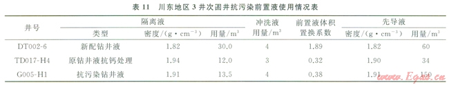 根據(jù)實踐,川東地區(qū)固井隔離液可以是無污染鉆井液加重后調(diào)整性能,也可以是用生物聚合物或膨潤土粉配置新的加重抗污染鉆井液,還可以是專用的高低密度隔離液體系。同時,現(xiàn)場根據(jù)相容性實驗評價狀況,沒計足量的隔離液與沖洗液,提高前置液體積置換系數(shù)[14],減少鉆井液與水泥漿直接接觸的可能性,增大隔離液與井壁接觸時間,改善頂替效果,保證了固井施工安全(表11)。