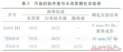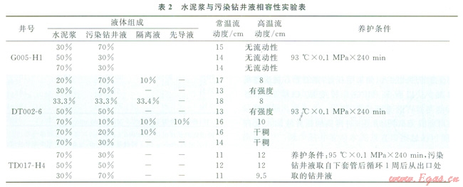 水泥漿水化過程中會產(chǎn)生Ca(OH)2并電離出Ca2+。當(dāng)水泥漿與鉆井液接觸后,Ca2+的存在使黏土顆粒聚結(jié)并形成網(wǎng)狀結(jié)構(gòu),表現(xiàn)為生成黏稠團塊的絮凝物質(zhì),使混漿的流動性變差。當(dāng)CO2污染的鉆井液與水泥漿混合后,相容性會變得更差,高溫養(yǎng)護條件下無流動性、干稠或者漿體形成的強度(表2)。對于污染嚴重的鉆井液,即使混入一定量的隔離液、先導(dǎo)液等(DT002-6井),也無法滿足設(shè)計要求。