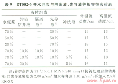 鉆井液受CO2污染影響較嚴重,但在調(diào)整鉆井液性能后兩者相容性實驗仍無法滿足固井施工要求,同時井場又不具備替換全部或部分井筒鉆井液條件,可采用抗Ca2+污染處理劑對鉆井液進行處理[11],本研究采用了KR-XX類鉆井液抗污染處理劑。由于該類處理劑中部分基團對Ca2+有很強螯合能力的特點,形成易吸附于水泥顆粒表面的螯合物,降低水泥水化速度,保證水泥漿與鉆井液之間的相容性實驗達到固井施工要求,DT002-6井在調(diào)整后的鉆井液中加入2.5%的KR-XX處理劑,較好地滿足了相容性實驗要求(表9、10)。