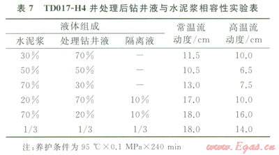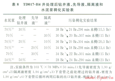 TD017-H4井固井前,對污染的鉆井液加入生石灰進行過飽和高鈣處理,同時配制先導(dǎo)液和隔離液,較好滿足鉆井液與水泥漿之間的相容性實驗要求(表7、8)。