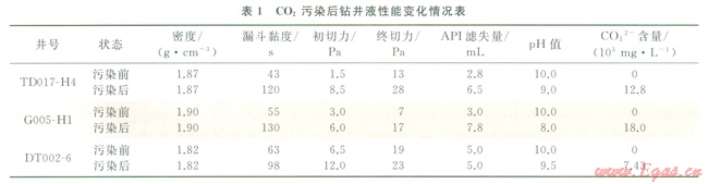 資料表明,CO2侵入鉆井液后,當(dāng)HCO3-和CO32-含量小于2000mg/L時,對鉆井液性能不會產(chǎn)生大的影響,鉆井液仍能維持較低的黏度和切力;當(dāng)HCO3-和CO32-含量大于2400mg/L時,鉆井液黏度和切力增加;當(dāng)HCO3-和CO32-含量大于2500mg/L,pH值不大于9時,鉆井液黏度和切力劇增、濾失量增大,此時難以有效調(diào)整鉆井液性能。同時隨著井溫的升高,HCO3-和CO32-對鉆井液性能的影響程度加劇[8]。表l為川東地區(qū)3口井的鉆井液受CO2污染前后的性能變化,數(shù)據(jù)顯示鉆井液受CO2污染后黏度和切力上升、失水增大、pH值降低,且性能變化程度隨CO2含量增加而加大。