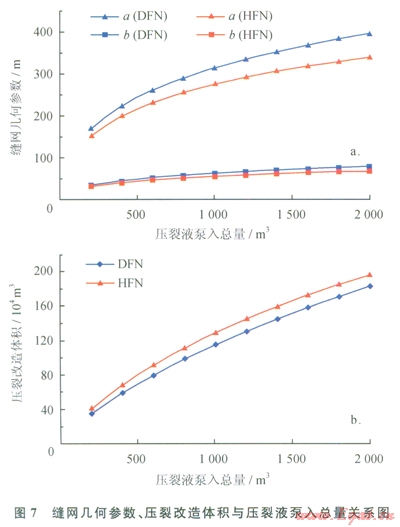 DFN模型和HFN模型計算所得縫網(wǎng)最大縫高分別為27.9m和27.2m,不隨壓裂液泵入總量的變化而變化。在其他條件相同的情況下,隨著壓裂液泵入總量的增大,a和b逐漸增大,壓裂改造體積逐漸增大;對于DFN模型,a由l71m增加至395m,b由34m增大至79m,壓裂改造體積由34×104m3增大至183×104m3;對于HFN模型,以由153m增加至340m,b由31m增大至68m,壓裂改造體積由40×104m3增大至l97×l04m3;在泵入相同體積壓裂液的情況下,利用DFN模型計算的縫網(wǎng)幾何參數(shù)比HFN模型計算值大(圖7-a);而利用DFN模型計算的壓裂改造體積比HFN模型計算值小(圖7-b)。