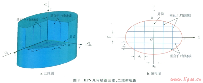 HFN模型考慮了壓裂過程中改造體積的實時擴展以及施工參數(shù)的影響,能夠?qū)σ淹瓿蓧毫堰M(jìn)行縫網(wǎng)分析,同時可以基于該分析對之后的壓裂改造方案進(jìn)行二次優(yōu)化設(shè)計。其不足之處在于模擬縫網(wǎng)幾何形態(tài)較為簡單,需借助于地球物理技術(shù)的幫助獲取部分參數(shù),同時由于不能模擬水平裂縫的起裂及擴展問題,及忽略了濾失問題,所以使用時具有較大的局限性。
