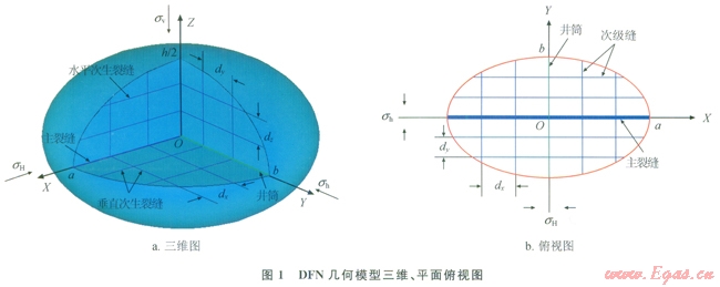 DFN模型基本假設(shè)如下:①壓裂改造體積為2a×2b×h的橢球體,由直角坐標(biāo)系XYZ表征,X軸平行于最大水平主應(yīng)力(sH)方向,Y軸平行于最小水平主應(yīng)力(sh)方向,Z軸平行于垂向應(yīng)力(sv)方向;②包含一條主裂縫及多條次生裂縫,主裂縫垂直于sh方向,在X-Z平面內(nèi)擴展,次生裂縫分別垂直于X、Y、Z軸,縫間距分別為dx、dy、dz;③考慮縫間十?dāng)_及壓裂液濾失;④地層及流體不可壓縮?;谝陨霞僭O(shè),作出DFN模型幾何模型的示意圖(圖1)。